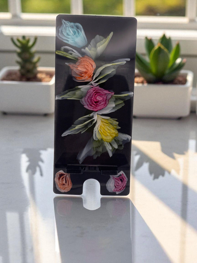 A bold and vibrant handmade resin phone holder featuring a sleek black base with a stunning multicolour 3D bloom design. Perfect for holding your phone while working, cooking, or video calling hands-free. Each piece is crafted in our Bournemouth studio, making it a unique blend of function and art.