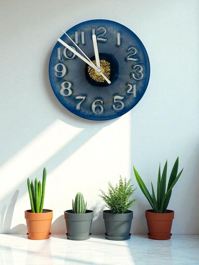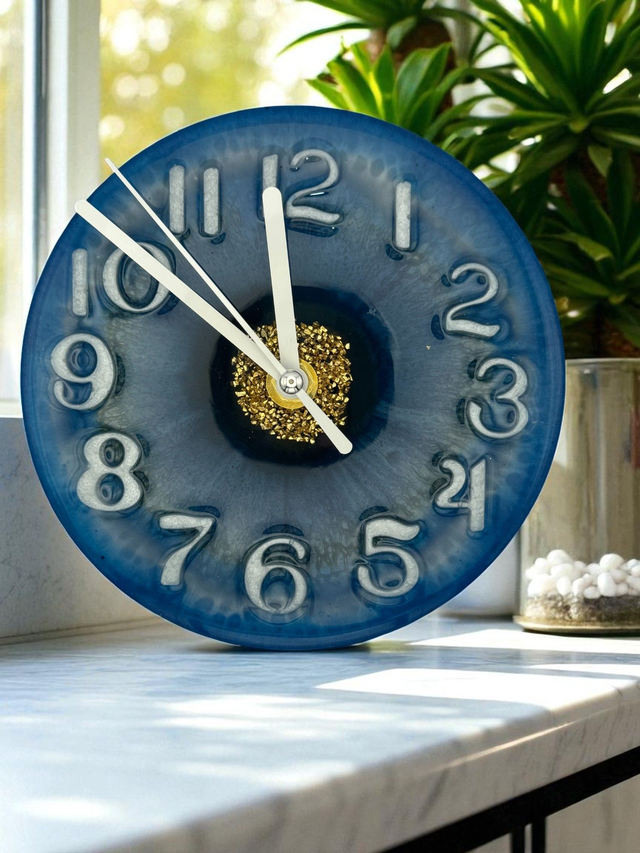 This small handmade blue resin wall clock blends elegance and modern design with a gold geode-inspired center and smooth, silent ticking ππ
