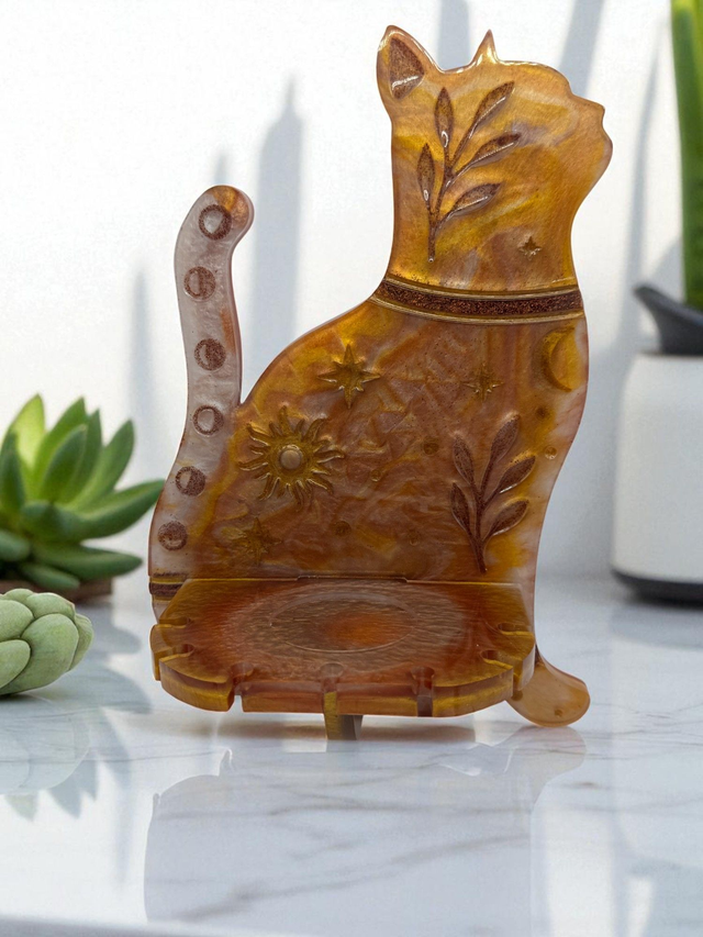 Infuse your space with warmth and enchantment using this handmade brown resin cat candle holder. With celestial symbols and earthy tones, it's perfect for cozy corners, altars, or boho-styled homes πŸˆβ€β¬›πŸ•―οΈ