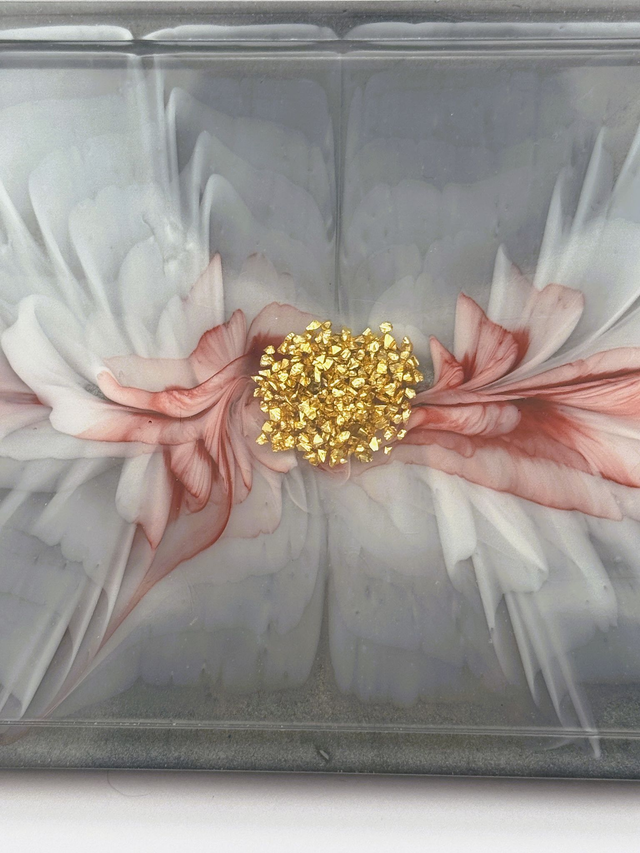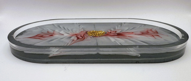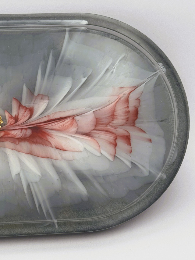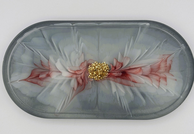 A captivating blend of artistry and function, this oval-shaped trinket tray features a delicate floral motif with petals in rich red and white hues. At its heart, a cluster of shimmering gold embellishments adds a luxurious touch, beautifully contrasting against the muted gray background. Perfect for holding jewelry, keepsakes, or simply enhancing your décor with refined elegance.