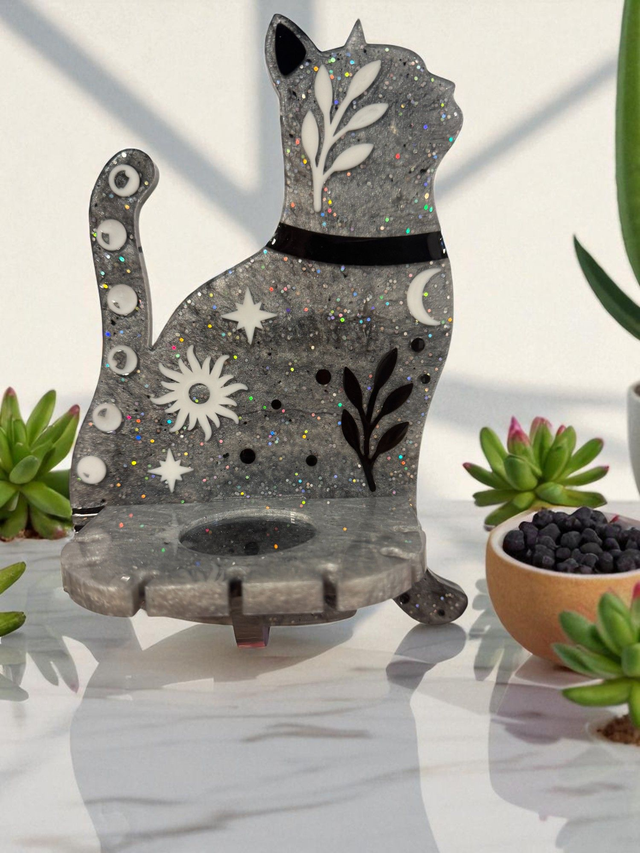 Bring a touch of magic to your space with this handcrafted gray resin cat candle holder. Decorated with moons, stars, and botanical elements, itโs the perfect mystical accessory for your altar, shelf, or sacred space ๐โจ