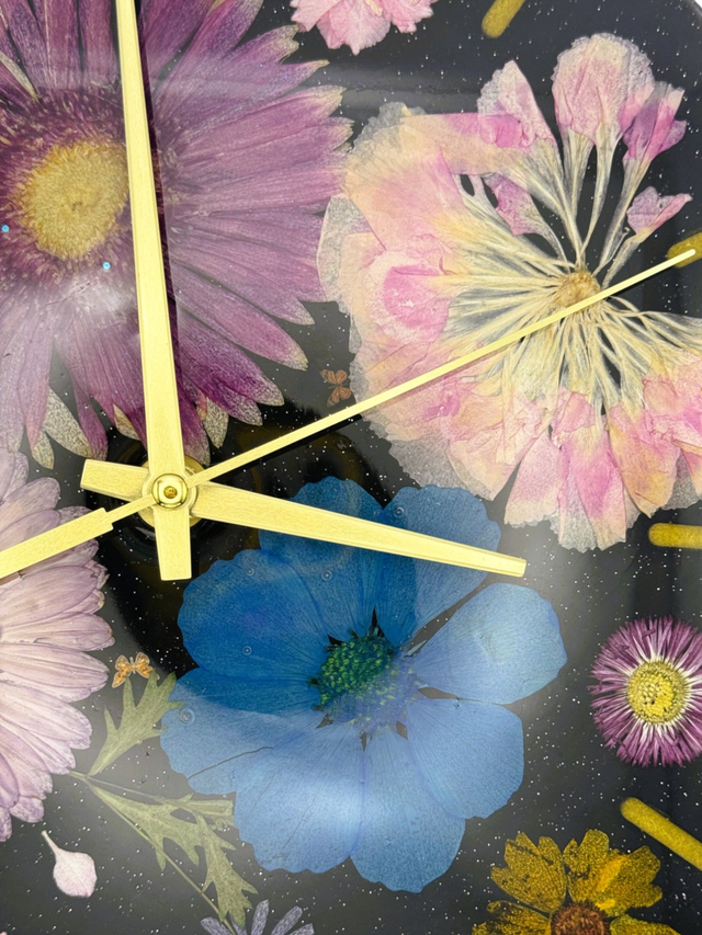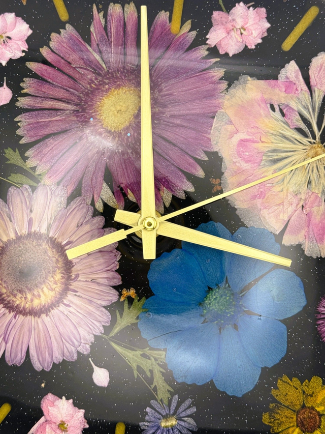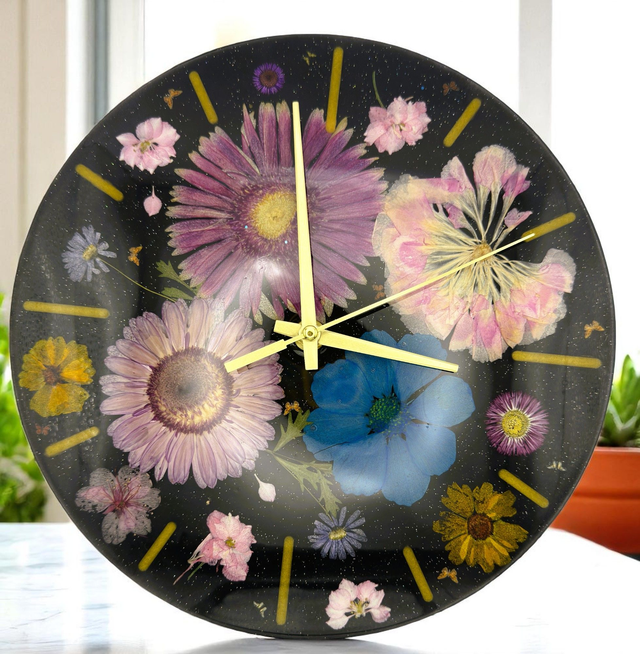 Add a touch of natural elegance to your space with this handcrafted black resin wall clock, beautifully embedded with real dried flowers.