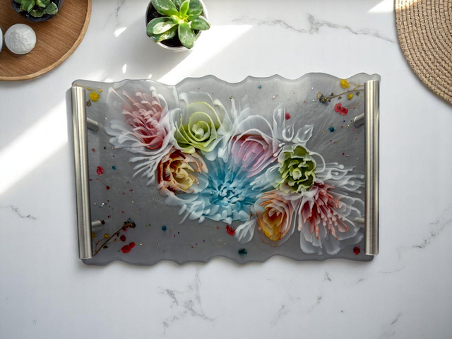 Resin Serving Tray with Multicolour 3D Flowers & Handles – Handmade Floral Home Decor